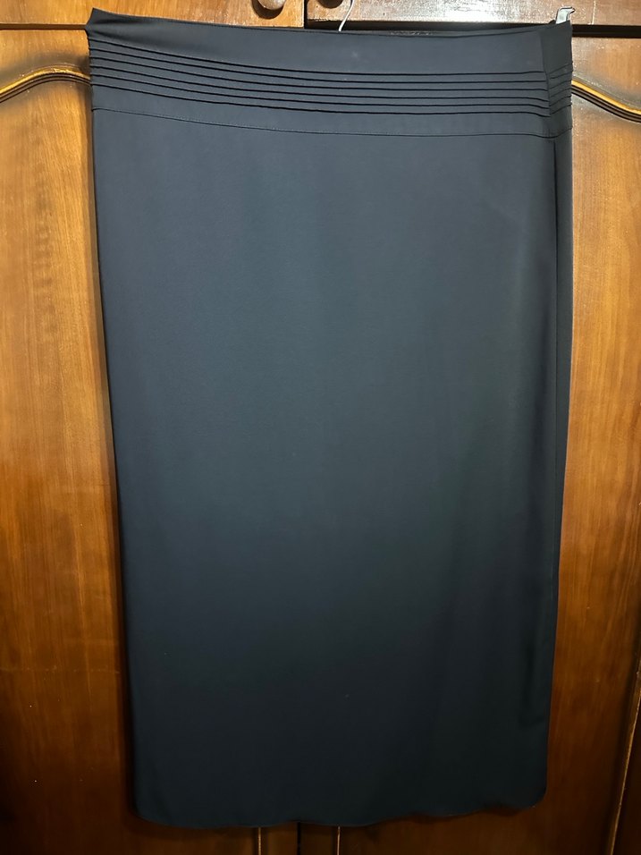 Lacivert uzun etek, belinde pilili detaylarla düz kesim ve sentetik kumaştan, ofis ortamı için uygun, çağdaş ve klasik şıklık sunar.