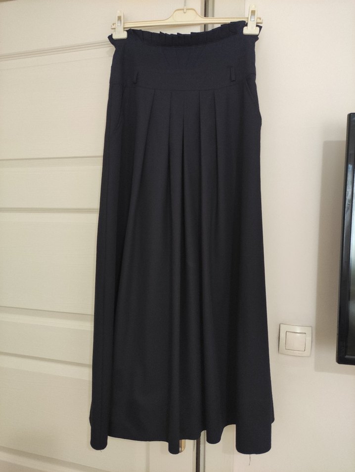 Siyah, pilili, bol kesim uzun etek. Sentetik kumaştan üretilmiş, minimal tasarımı ofis şıklığı için uygundur.