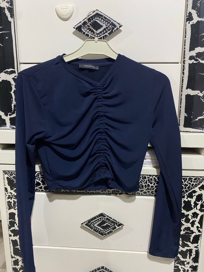 Kadınlar için uzun kollu, bisiklet yaka ve pilili detaylı, dar kesim mini bluz. Yumuşak sentetik kumaştan, koyu mavi renkte, minimalist sokak stili, günlük kullanım için uygundur.