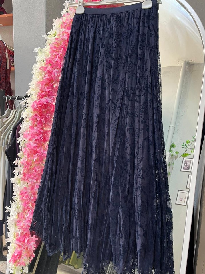 Kadınlar için piliseli, bol kesim lacivert uzun etek. Yumuşak sentetik kumaştan, bohem ve retro tarzlara uygun. Parti için ideal.