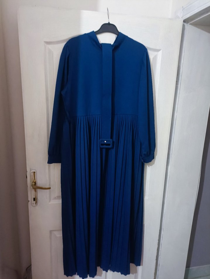 Lacivert uzun elbise piliseli detaylara ve bol kesime sahiptir. Uzun kollu ve kesikli yakalı, ofis kullanıma uygundur.