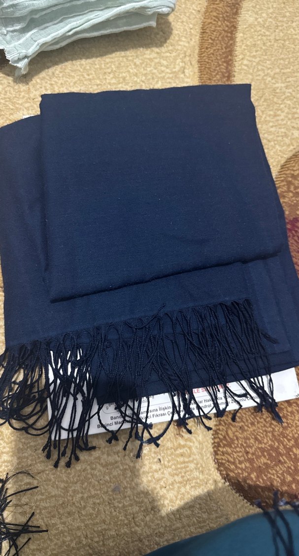 Kadınlar için koyu mavi renkli, ipek dokulu ve püsküllü şal. Rahat ve bohem tarzda, sade ve temel görünüme uygundur.