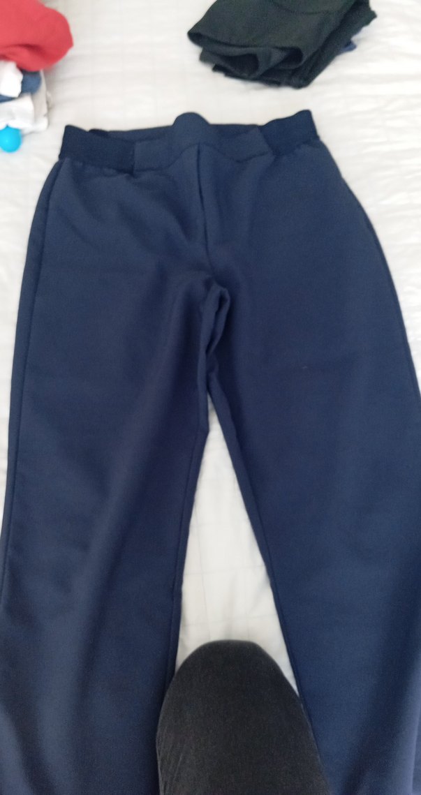 Kadınlar için koyu mavi, rahat kesim, yumuşak ve sıcak kumaştan yapılmış midi boy, sade tasarımlı kumaş pantolon.