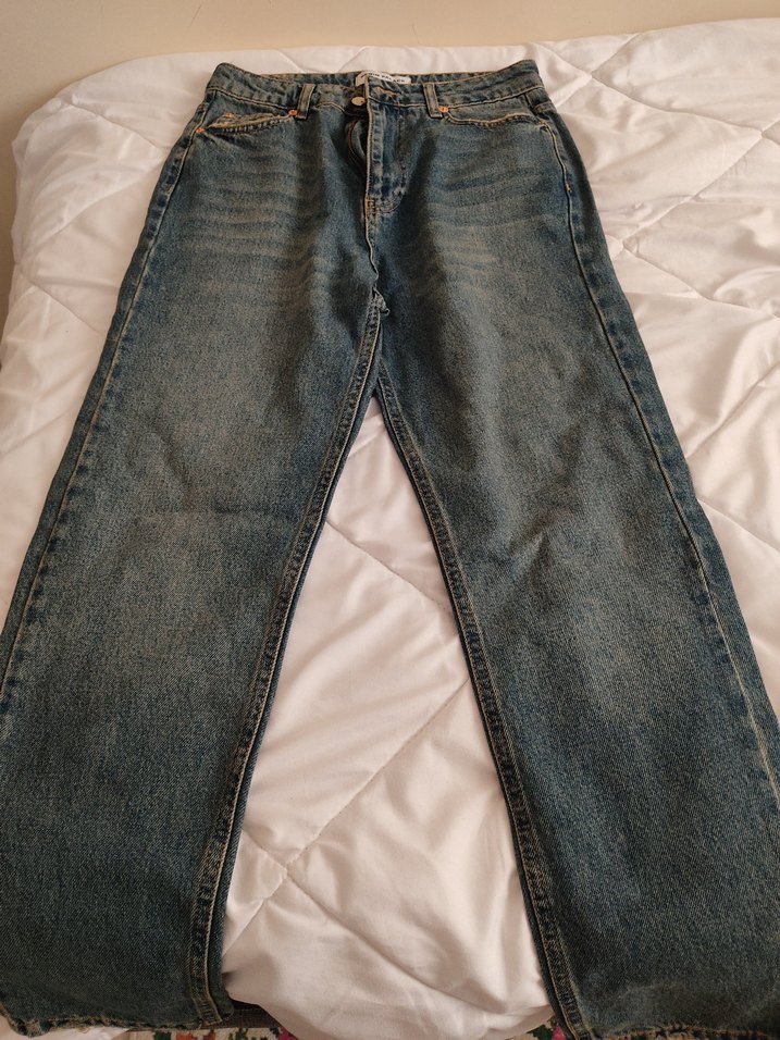 Lacivert renkte, rahat kesim ve normal midi boyda kot pantolon.