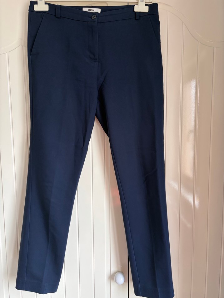 Lacivert denim kumaştan, regular fit ve normal boyda kadın pantolon. Ofis için uygun, normcore tarzında zahmetsiz şıklık sunar.
