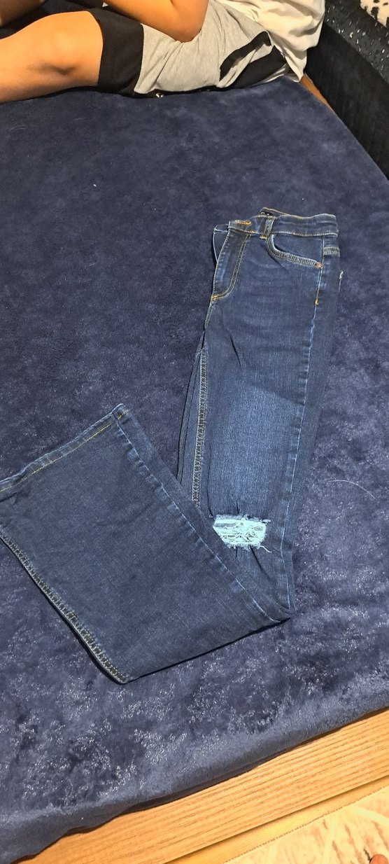 Lacivert renkte, regular fit midi boy, kot kumaştan yapılmış, tokalı ve hafif yıpranmış detaylı kadın pantolonu, günlük kullanıma uygun.