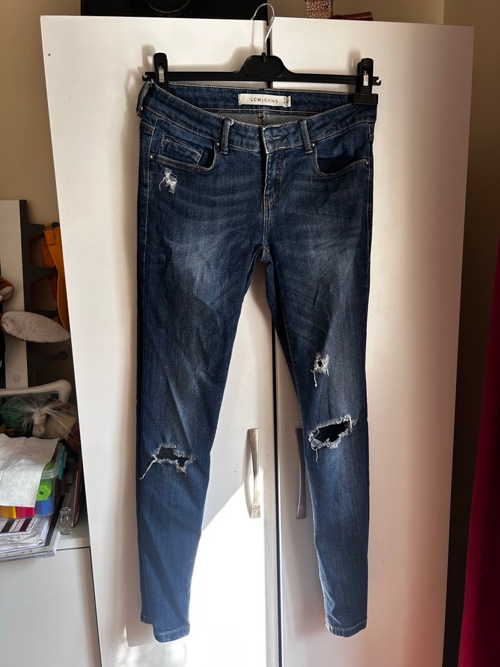 Lacivert renkli, bol kesim kot pantolon, tokalı detaylı ve yırtık desenli, günlük kullanıma uygun rahat sokak stili jean.