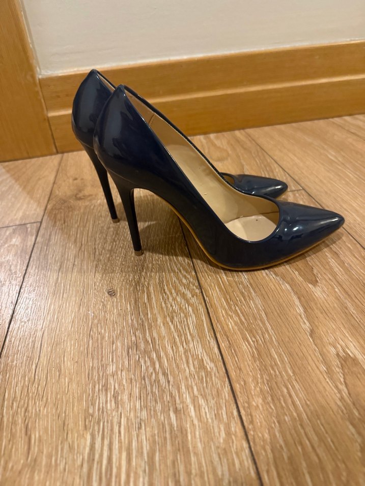 Ofis kullanımı için uygun, klasik ve çağdaş görünümlü, lacivert parlak rugan stiletto topuklu ayakkabılar. Desensiz ve şık tarzda.ürün bir kaç kez giyildi