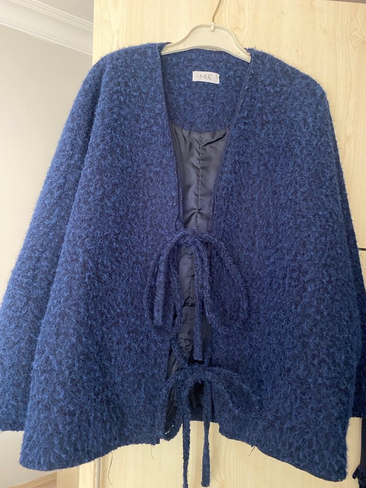Kadınlar için koyu mavi, örgü dokulu ve batik desenli salaş ceket. Uzun kollu ve yaka kısmı kesik detaylı, günlük rahat kullanım için uygundur.