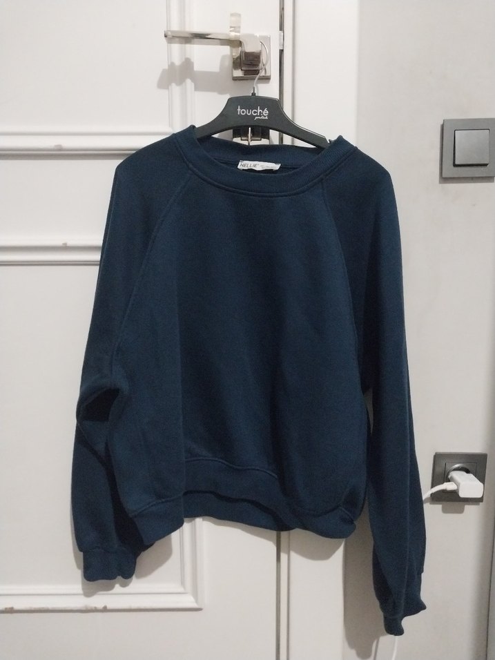 Kadınlar için yuvarlak yakalı, uzun kollu, salaş kesim sweatshirt. Koyu mavi renkte, yumuşak ve sıcak kumaştan üretilmiş, minimal ve rahat sokak stili için ideal.