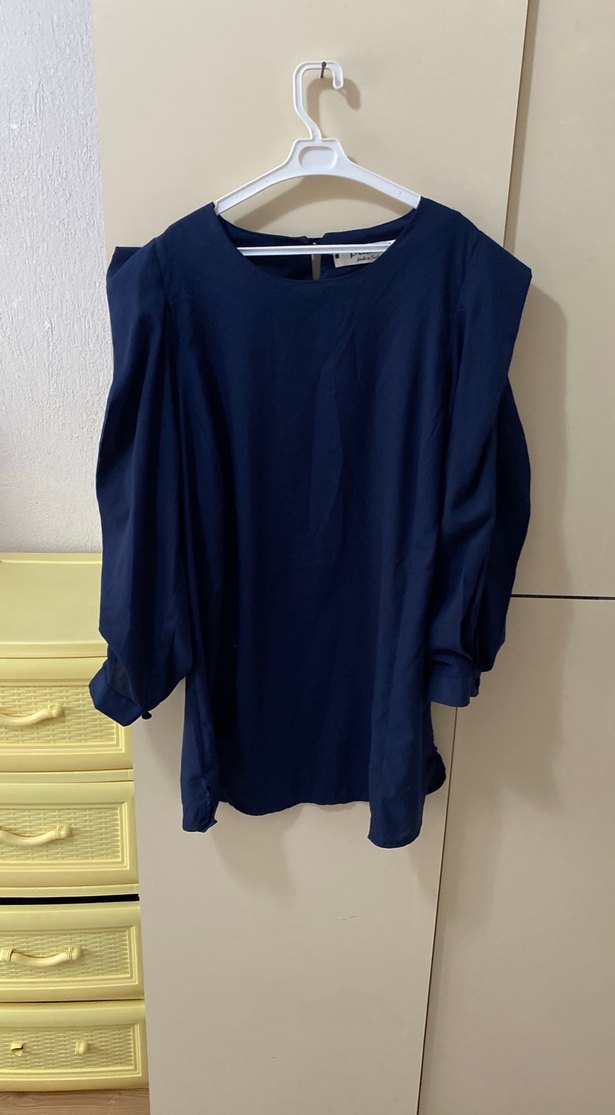 Kadın lacivert bluz, uzun kollu ve yuvarlak yakalıdır. Salaş kesimi ve drapeli detaylarıyla normal midi boyda, minimalist sokak stili sunar.