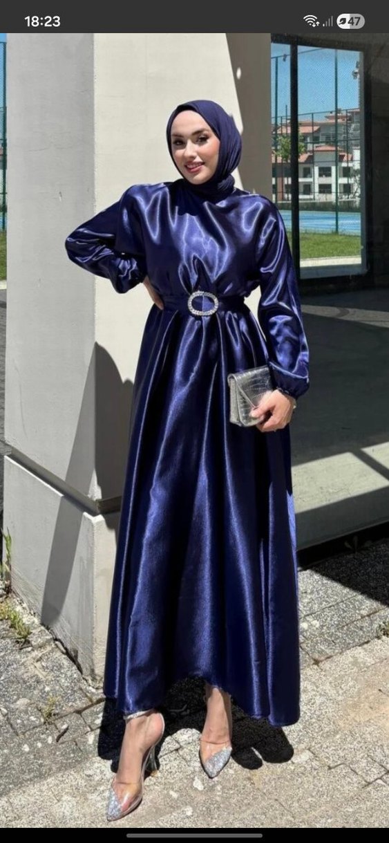 Kadınlar için uzun, parlak lacivert saten kumaştan, bol kesim elbise. Uzun kollu, tekne yaka ve kemerli. Bağlama desenli, davet ve şık sokak stili için uygun.