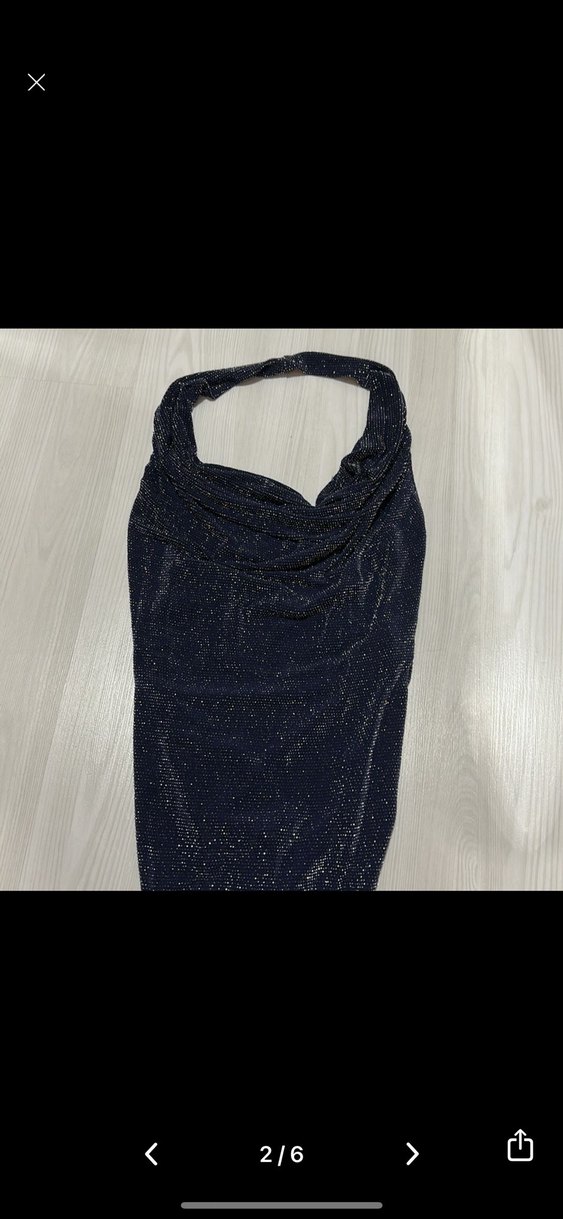 Lacivert renkli, kolsuz ve vücuda oturan Hafif ışıltılı dokusu ile gotik şıklık sunar.