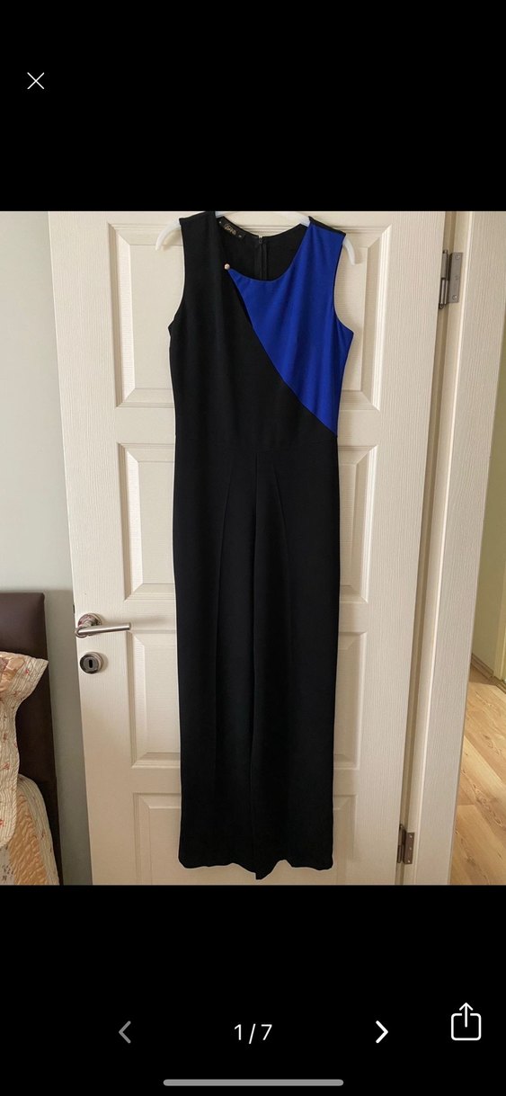 Kadınlar için lacivert ve siyah renklerde, drapeli, askısız ve kolsuz uzun tulum. İpek gibi kumaştan, ofis için uygun düzenli kesim.