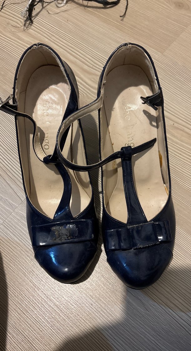 Kadınlar için koyu lacivert renkte, stiletto topuklu ve kemerli kayışlı kauçuk klasik ayakkabılar. Ofis için uygun, modaya uygun gotik tarzda. Kusurları göründüğü gibi