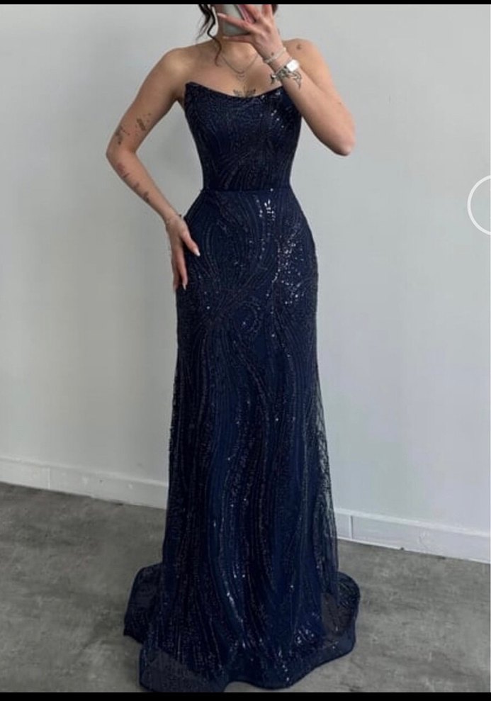 Lacivert renkli, straplez uzun abiye elbise, vücuda oturan kesimi ve ışıltılı detaylarıyla düğünler için uygundur. Kolsuz, çağdaş tarzda, desensiz tasarıma sahiptir. ✨ m beden yazıyor ama ben daralttım. İsteyen pensleri açtırıp kullanabilir M bedene de uygun kilom 51 ben kendime göre daraltırdım.