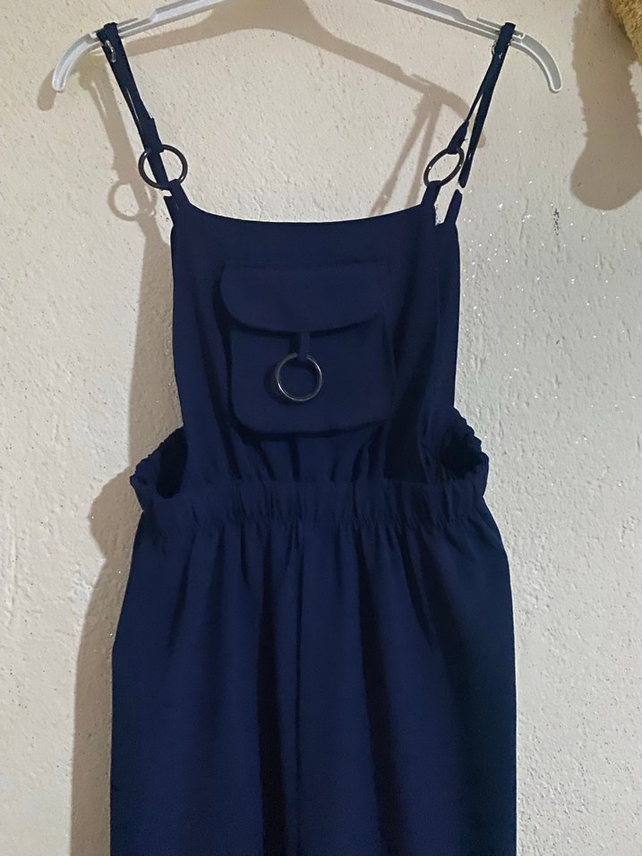 Lacivert, ayarlanabilir tokalı askılı, önünde halka detaylı cep bulunan, sentetik kumaştan yapılmış, normal boy ve vücuda oturan midi tulum.
