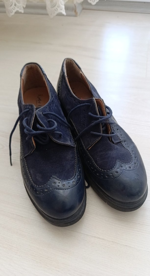 Kadınlar için koyu lacivert süetten yapılmış, klasik ve bağcıklı tasarıma sahip ayakkabılar. Desensiz ve zamansız bir görünüme sahiptir.