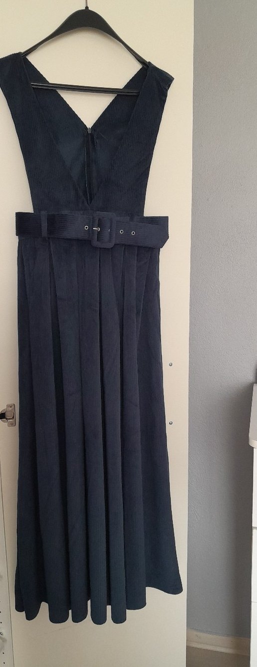 Lacivert süet kumaştan, kemerli ve askılı uzun elbise. !! İADE YOKTUR !!