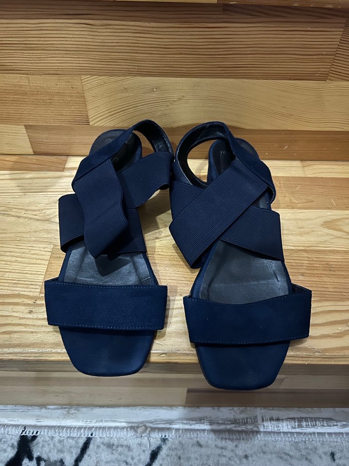 Kadınlar için lacivert renkli, topuklu ve tokalı kauçuk sandaletler. Minimalist ve normcore tarzıyla günlük kullanıma uygundur.