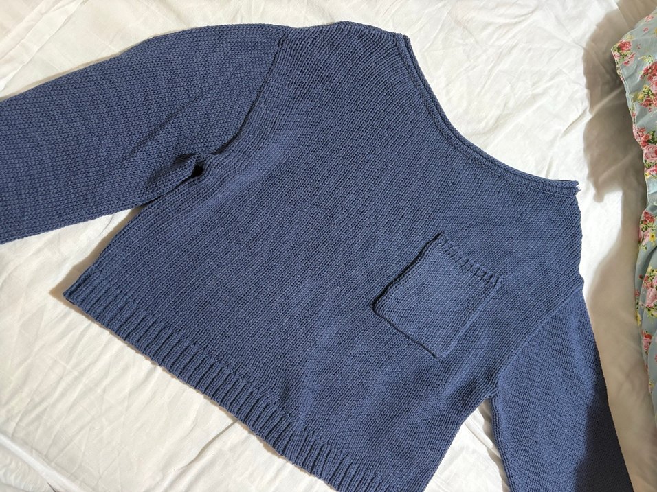 Kadın lacivert triko kazak, yuvarlak yaka ve uzun kolludur. Rahat kesimli, düz desenli ve midi boydadır. Küçük cep detayı vardır, günlük kullanım için uygundur.