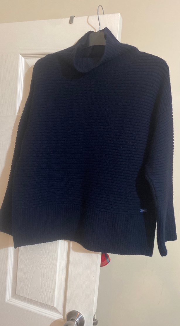 Kadınlar için örme dokulu, boğazlı ve uzun kollu yün kazak. Lacivert renkte, bol kesim ve günlük kullanıma uygun.