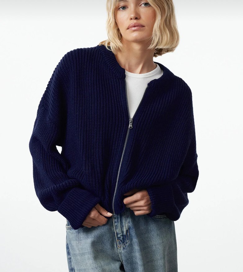 Kadınlar için örgü dokulu, fermuarlı, bol kesim ve uzun kollu triko. Lacivert renkte, günlük sokak stiline uygun bir parça.