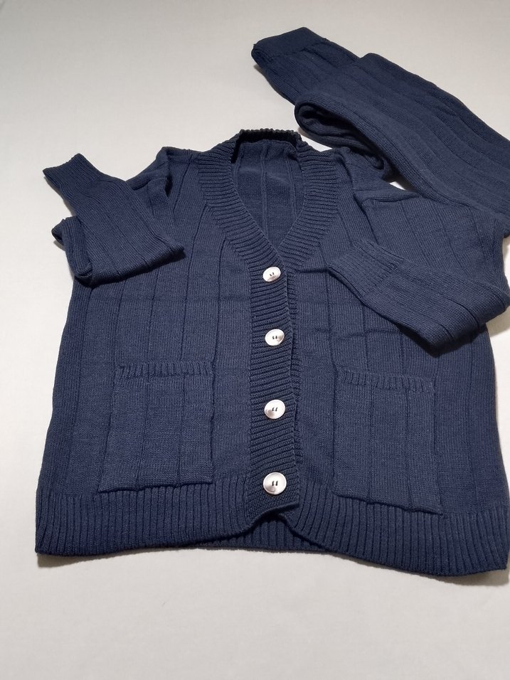 Kadınlar için lacivert renkli, düğmeli, uzun kollu, triko kumaştan yapılmış, regular fit hırka. Düz ve cepli tasarım sunar.