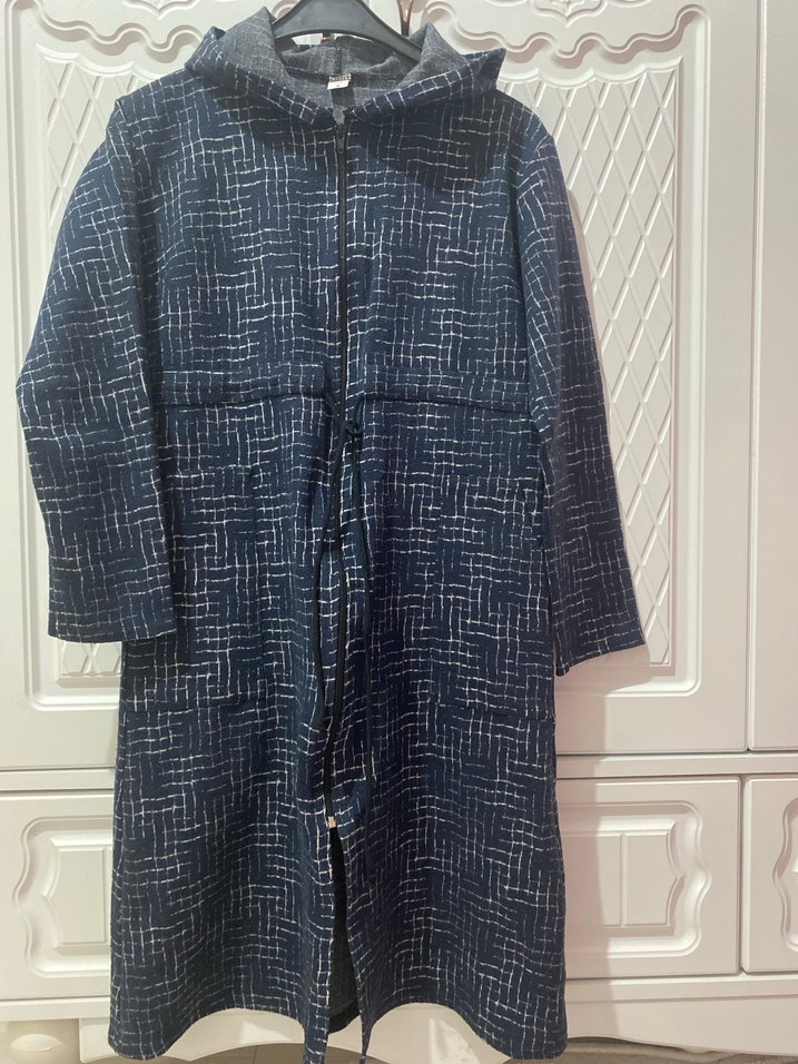 Kadınlar için uzun boy, rahat kesim kot kumaştan yapılmış lacivert ve gri desenli kaban. Uzun kollu, kesik yaka ve fermuarlı önü ile rahat ve şık.