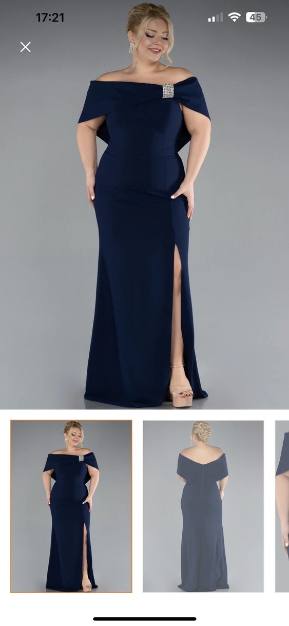 Lacivert uzun abiye elbise, kayık yaka ve vücuda oturan kesime sahiptir. Yırtmaçlı ve ince askılı kollu, klasik ve modern dokunuşlar sunar.