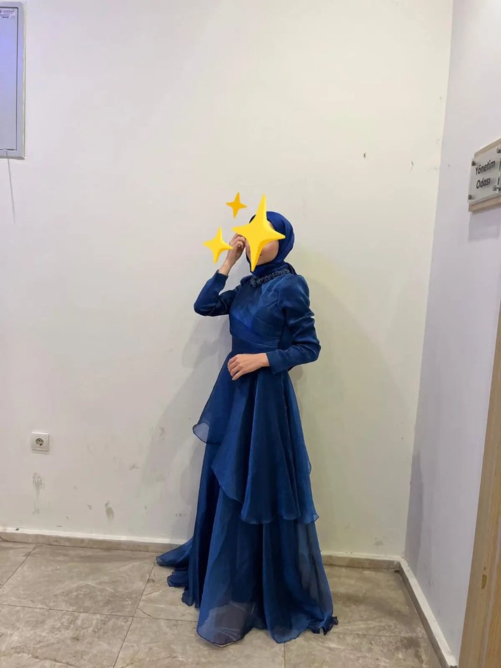 Lacivert renkli uzun abiye elbise, yüksek yakalı ve uzun kolludur. Drapeli tasarımı ve batik desenlidir. Düğünler için uygun, regular fit modeldir.