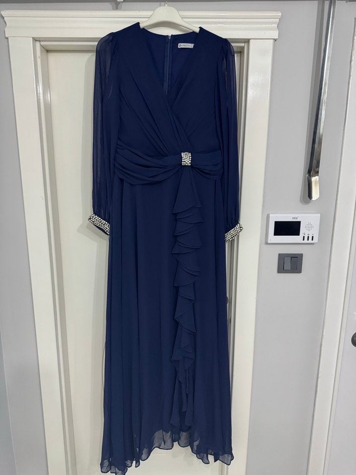 Lacivert uzun abiye elbise, uzun kollu ve V yakalıdır. Salaş kesimi, büzgülü detayları ve taş süslemeleriyle düğünler için uygundur. Sorunsuzdur düğünde 2 saat giyildi bu fiyata kaçırmagın çok güzel efil efil kilolu basenli insanları zayıf gösterir. Kamufle ediyor. Ölçü mevcuttur