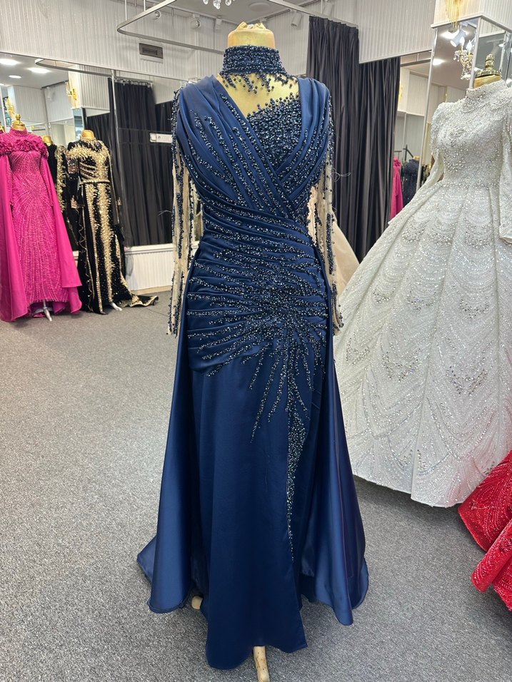 Lacivert, V yakalı, kolsuz uzun abiye elbise, parlak işlemeli ve drapeli detaylara sahip. Klasik ve çağdaş tarzda, düğünler için uygun, normal kesim.