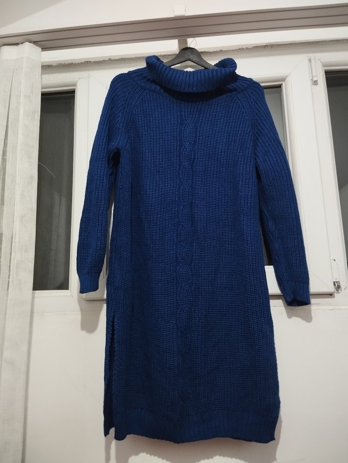 Lacivert renkte, uzun boy ve boğazlı yakalı örme triko kazak. Bol kesimi ve uzun kollarıyla rahat ve şık bir günlük kullanım seçeneği.