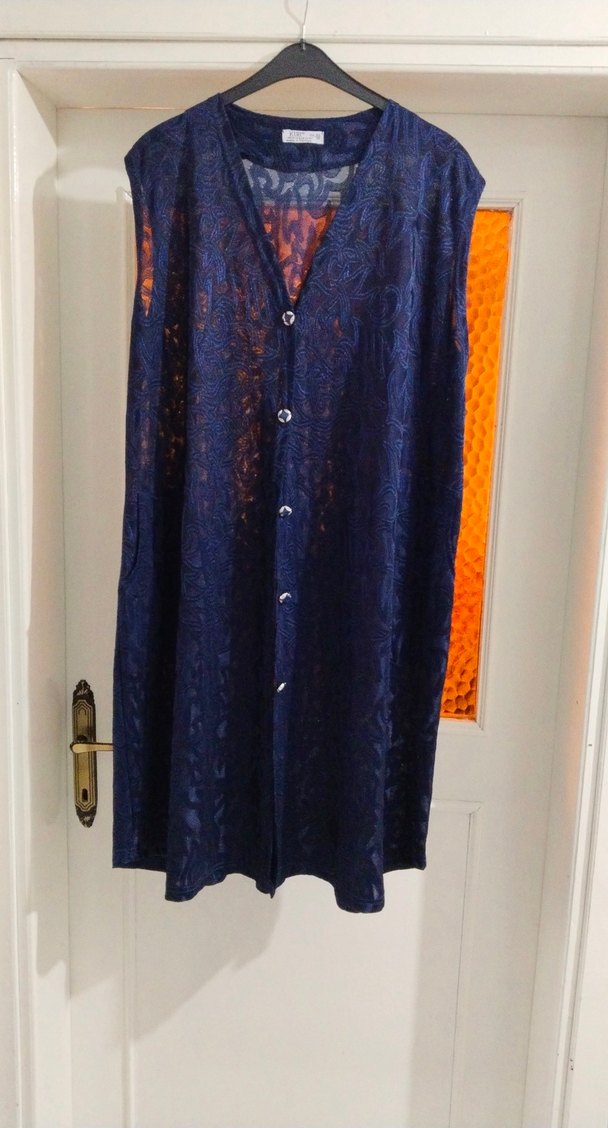 Kadınlar için kolsuz, bol kesim, koyu lacivert tie-dye desenli bohem tarzında uzun elbise. Ön kısmı düğmeli.