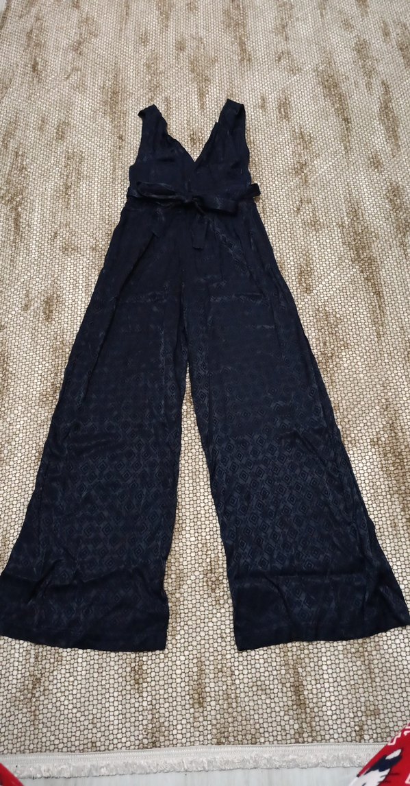 Kadınlar için lacivert uzun tulum, bol kesim, kemerli ve yakası kesim detaylıdır. Askılı kollu, dokuma kumaştan, açık hava için uygundur ve yan tarafında fermuar bulunan cepli tulum.