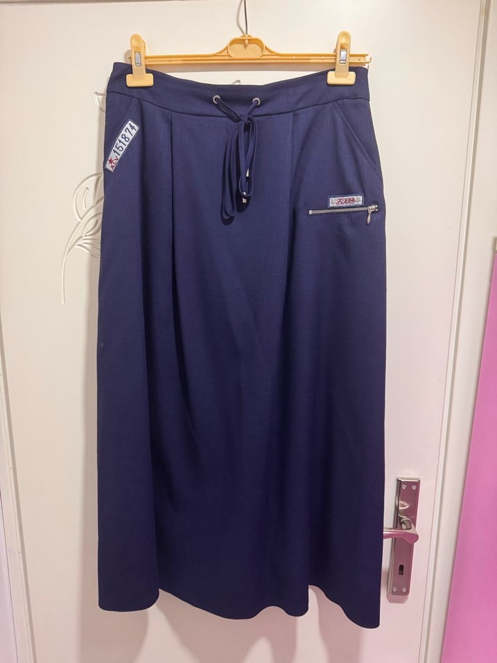 Kadınlar için uzun, bol kesim lacivert etek. Sentetik kumaştan, belden bağlamalı ve fermuarlı cep detaylıdır. Günlük rahat kullanıma uygundur. Marka temsilidir alvina markasına ait etek çok az kullanılmıştır. Cepli modeldir bel 40 boy 90 cm. Merak ettiklerinizi sorunuz iade kabul edilmemektedir