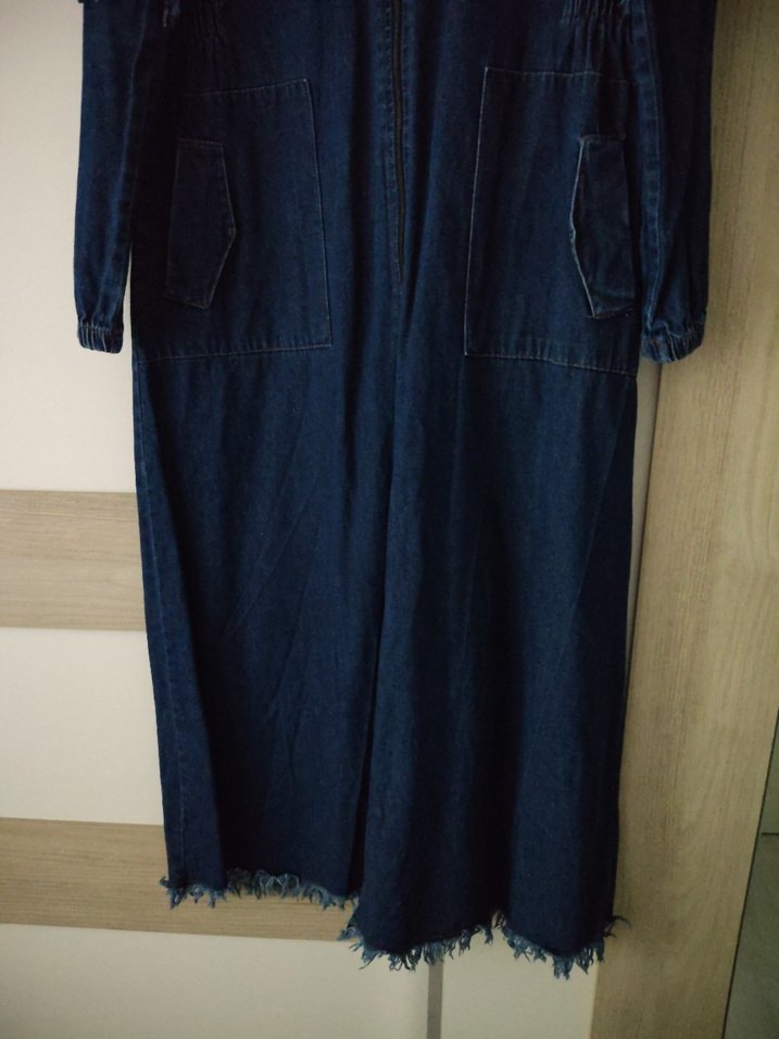 Kadınlar için uzun, bol kesim lacivert denim ceket. Çentikli yaka, düğmeli ve iki ön cepli. Uzun kollu ve salaş, günlük sokak stili için uygun.ölçüleri : boyu 126 cm ,kol boyu 64 kol eni 19 ,iki koltuk altı arası 50 cm,iki omuz arası 40 cm .