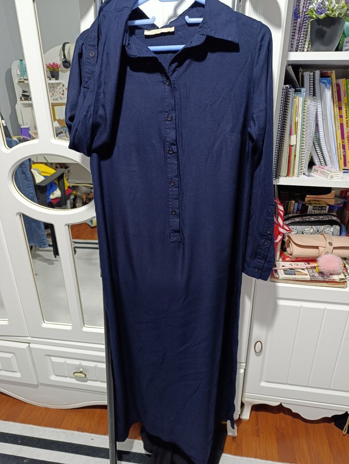 Kadınlar için uzun, bol kesim, uzun kollu ve yakalı lacivert denim elbise. Önden düğmeli, günlük rahat kullanım için uygundur.