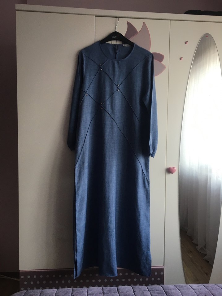 Lacivert uzun denim elbise, bisiklet yaka ve ince askılı, rahat kesim ve drapeli tasarımla günlük kullanıma uygun.