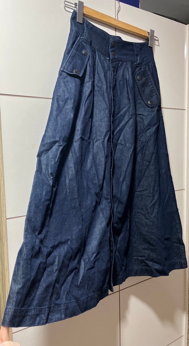 Lacivert uzun denim etek, drapeli ve bol kesimlidir. Günlük kullanıma uygun, normcore tarzda ve düğme detaylıdır.