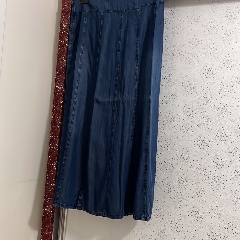Kadınlar için uzun, lacivert denim kumaştan üretilmiş, bol kesim ve drapeli stilde, rahat ve şık bir etek. Etekteki katlanma çizgisidir sorun yoktur.