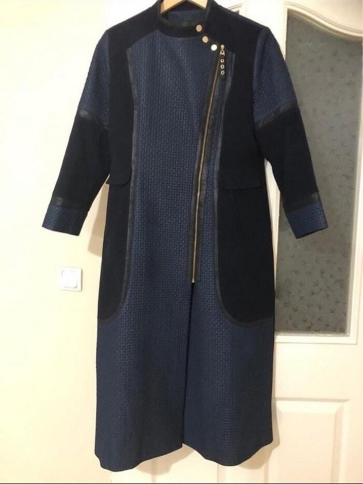 Kadınlar için uzun kesim lacivert denim kaban, yaka detaylı ve fermuarlı kapamalı. Regular fit ve uzun kollu, günlük kullanıma uygun modern Paris tarzı.