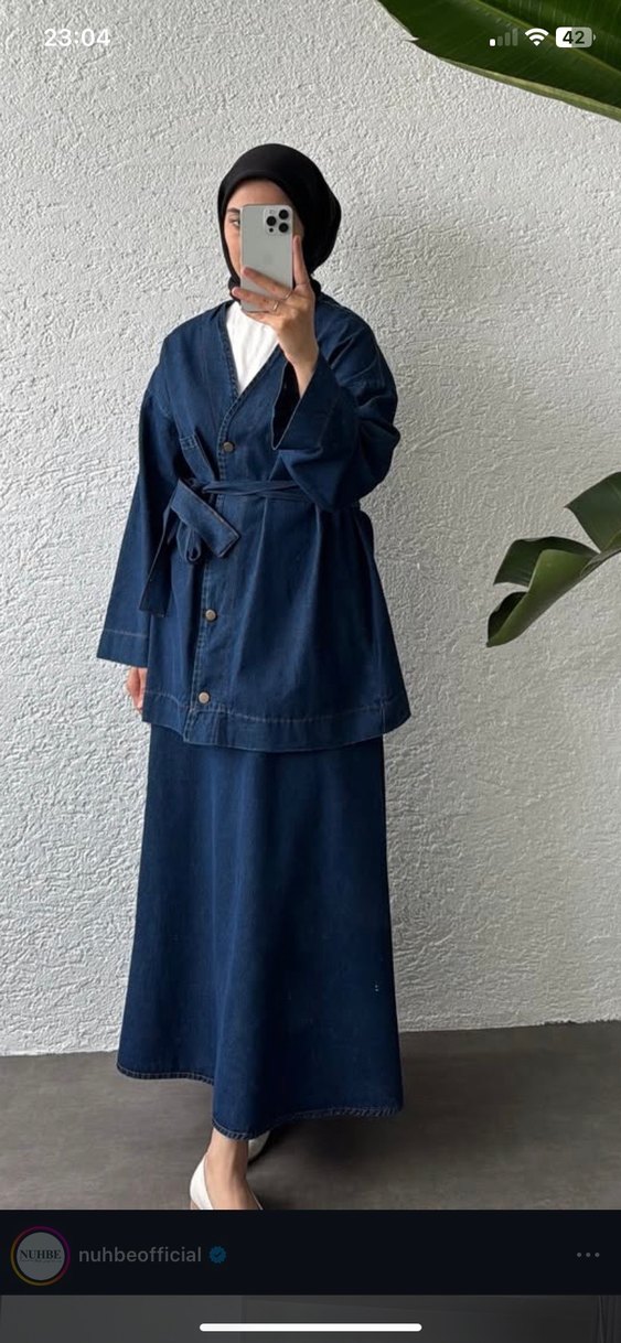 1 beden lacivert denim kumaştan yapılmış kimono takım. yakalı, askılı kollu, kemerli, sade ve mütevazı tarzda günlük kullanıma uygun. ÜST KOTU BİRAZ KISALTTIM FAKAT ÜRÜNÜ HİÇ KULLANMADIM. Nuhbe markasına ait. Site fiyatı 1800