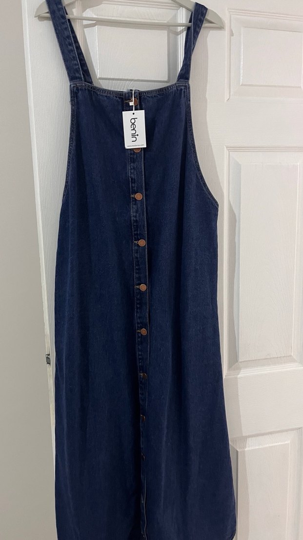 Daha önce hiç giyilmedi etiketli Düğmeli, askılı, kolsuz, bol kesim lacivert denim tulum. Günlük kullanım için uygun,