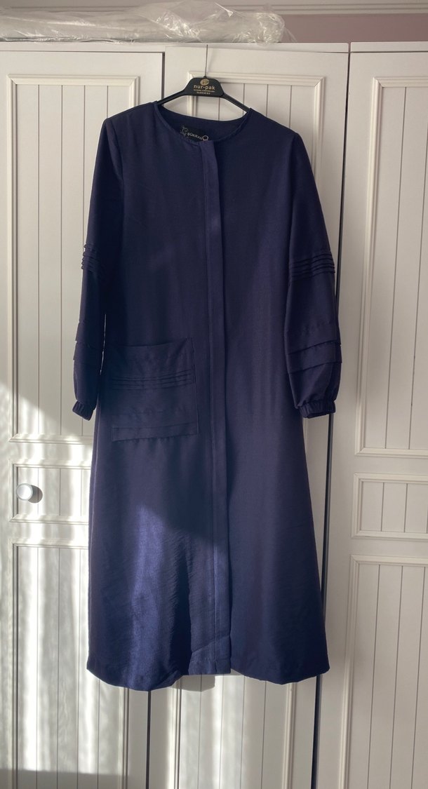 HASARSIZ HARİKA KALİTE KOLU VATKALI Kadın lacivert uzun kaban, dokulu kumaştan, regular fit ve uzun kollu. Ofis için minimal ve sade tarzda, yakasında kesik yaka detayı bulunur.