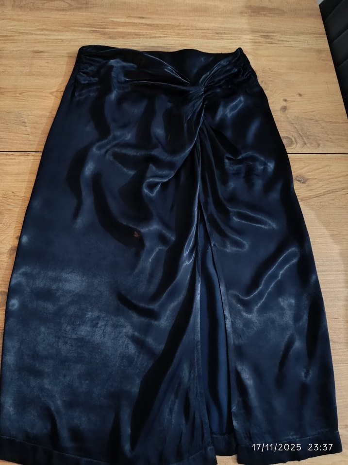 Lacivert uzun yırtmaçlı etek, dökümlü ve ipeksi kumaştan, bol kesim. Gotik tarzda romantik akşamlar için uygun. kullanıma engel kusuru yoktur.