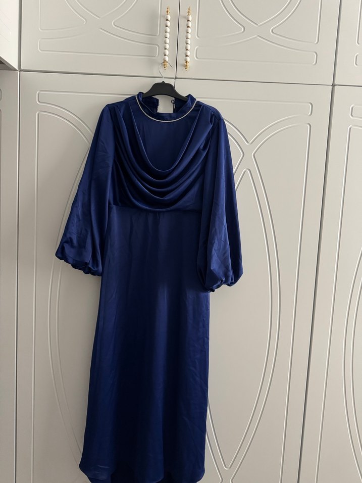 Lacivert renkte, uzun, drapeli yakalı ve uzun kollu, bol kesim kadın elbisesi. Minimalist ve modern klasik tarzda, zarif bir görünüm sağlar.