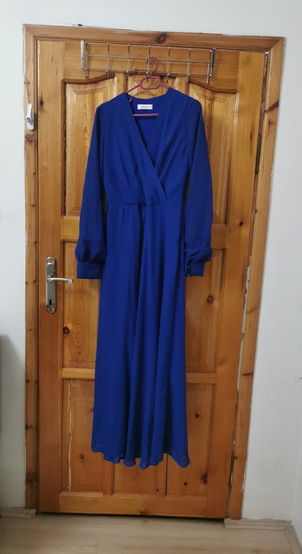Lacivert, uzun kollu, drapeli ve yakalı uzun elbise. İpek gibi kumaştan, bol kesim, sade ve bohem tarzda, ofis kullanıma uygun. çok az giyildi.