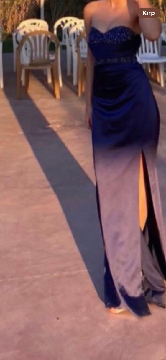 Lacivert uzun, drapeli ve fit kesim etek. İpeksi dokusuyla romantik ve şık bir görünüm sunar. Hafif tie-dye deseni vardır.